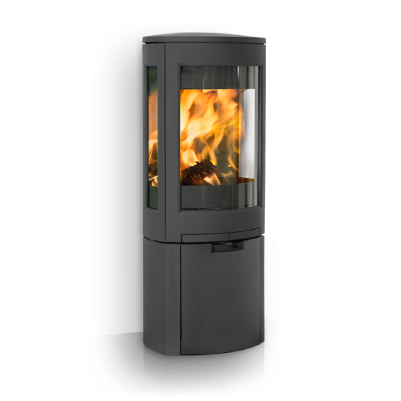Jøtul F 378 Advance stojí na podstavci s litinovými dvířky. Moderní, čisté linie od shora až dolů.