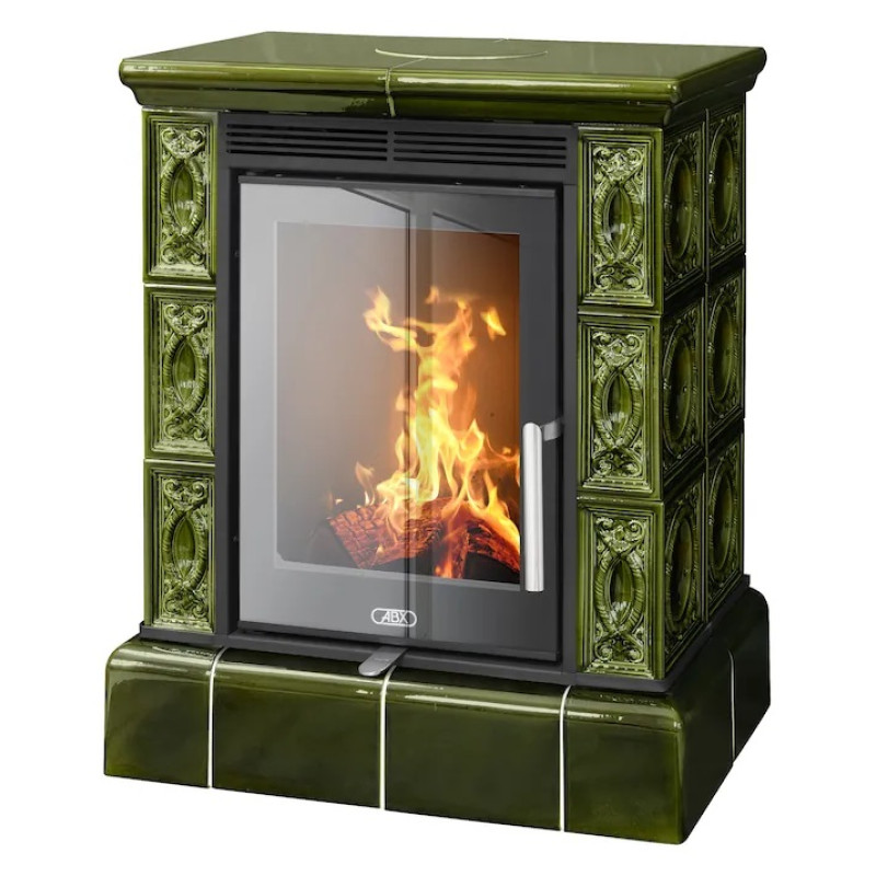 Kachlová krbová kamna ABX Helvetia exklusive kachlový sokl, černý korpus, opláštění kachle zelená
