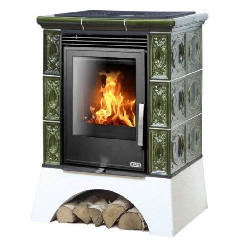 Kachlová kamna ABX Helvetia s teplovodním výměníkem, černý korpus, bílý sokl, opláštění kachle zelená