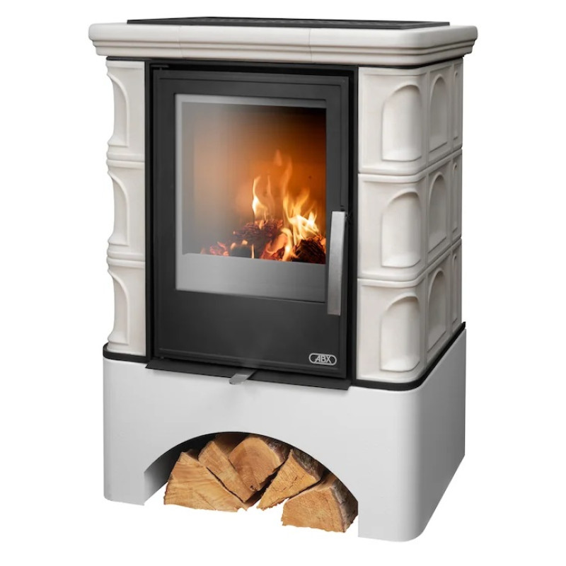 Kachlová kamna ABX Iberia s výměníkem, bílý sokl, černý korpus, opláštění kachle ahornweiss