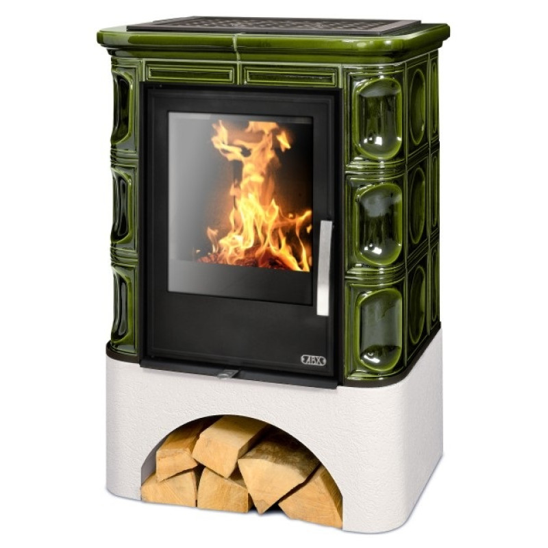 Kachlová kamna ABX Marina s výměníkem 6,9kW., bílý sokl, černý korpus, opláštění kachle zelená