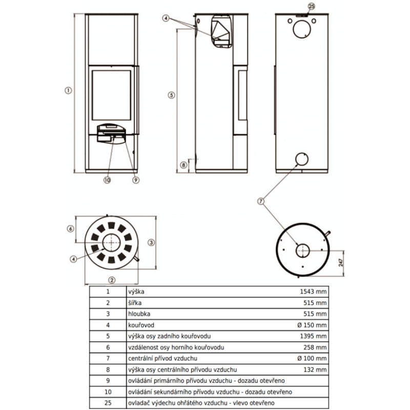 - kamna mají centrální přívod vzduchu o průměru 100 mm (Nutno přikoupit speciální přírubu, která se montuje zezadu na záda kamen.)