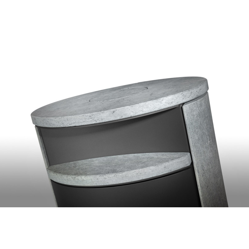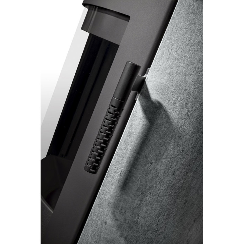 Oválný tvar krbových kamen LUGO N působí v interiéru útulným dojmem. Příjemnými detaily jsou například odkládací parapet nad ohništěm nebo klika dvířek, která svým technickým řešením i designem dává krbovým kamnům elegantní vzhled.