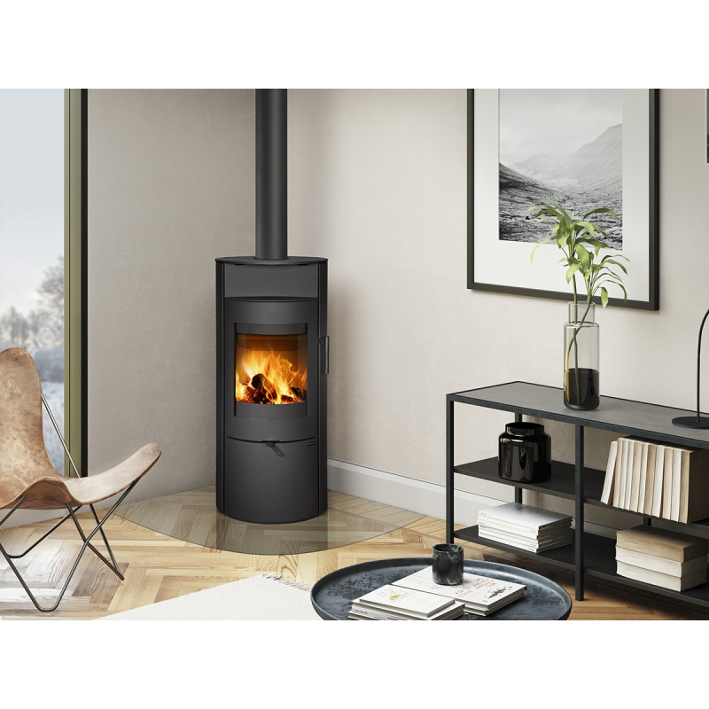 Oválný tvar krbových kamen LUGO N působí v interiéru útulným dojmem. Příjemnými detaily jsou například odkládací parapet nad ohništěm nebo klika dvířek, která svým technickým řešením i designem dává krbovým kamnům elegantní vzhled.