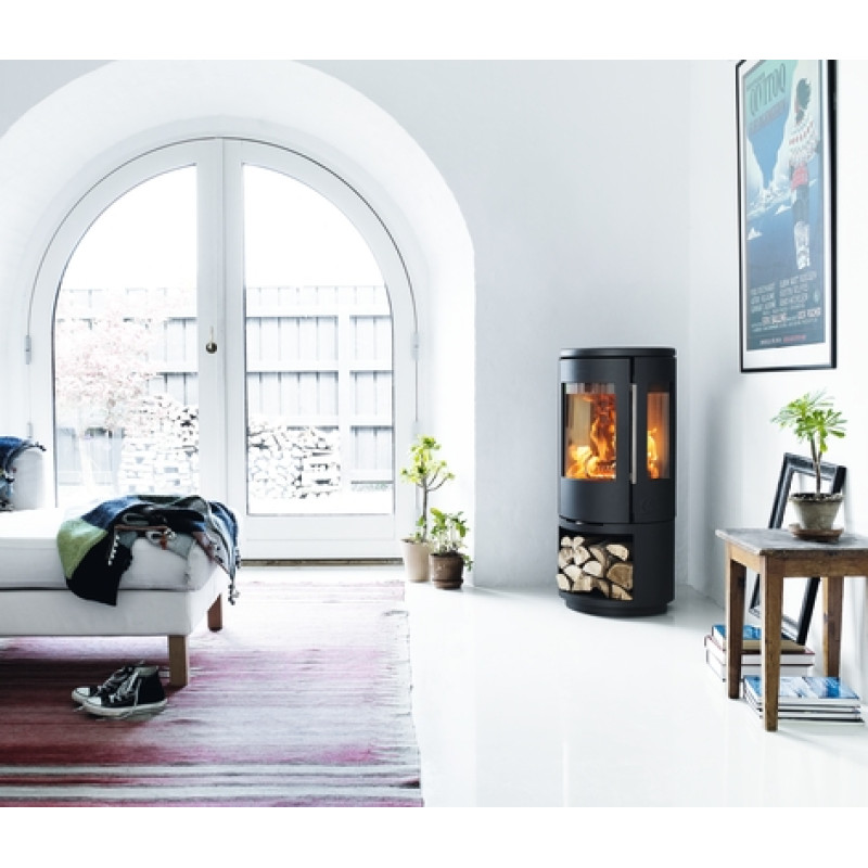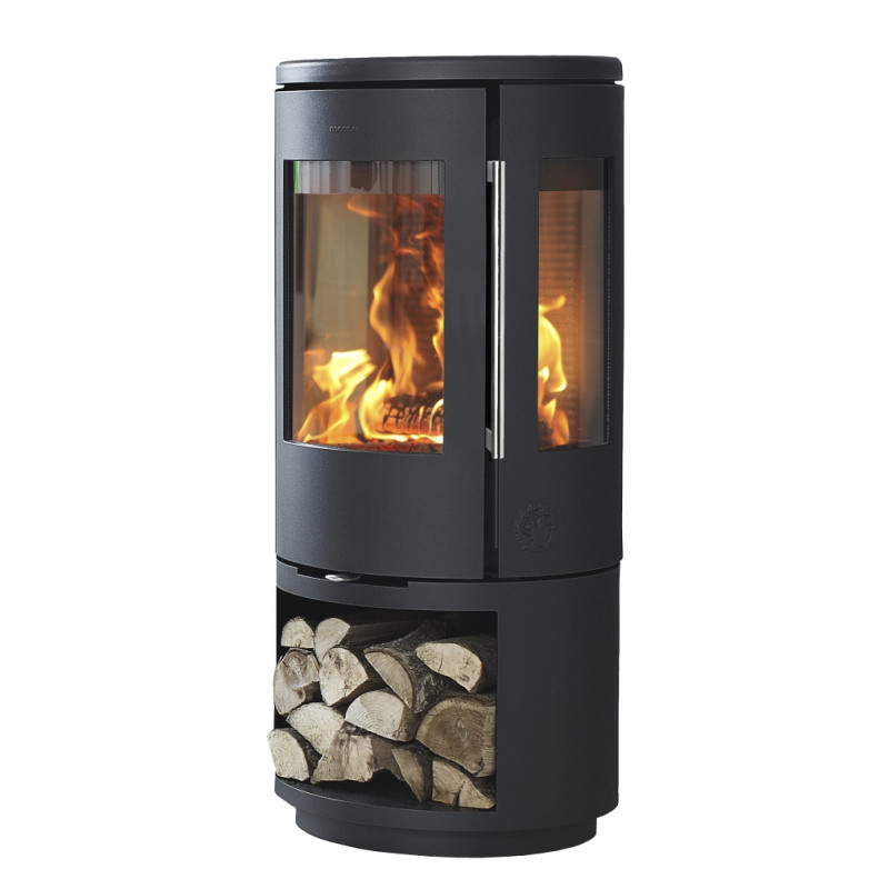 Model Morsø 7443 je k dispozici s prostorem určeným ke skladování dřeva.