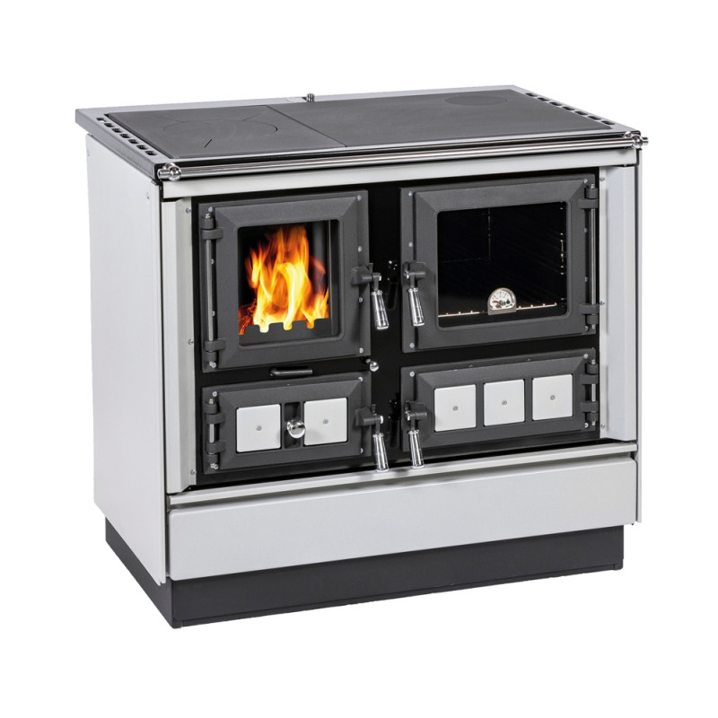 Sporák na pevná paliva světle šedý pravý, chromované doplňky, smaltovaný rám plotny, ocelová broušená plotna