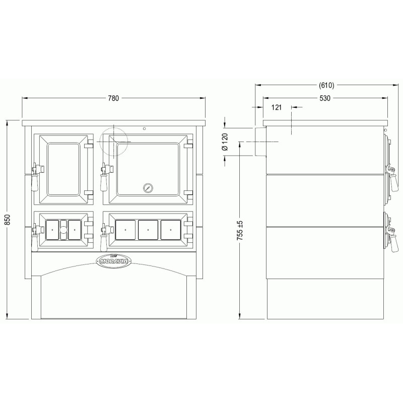 Sporák na pevná paliva s troubou KVS MORAVIA typ 9180 Ofélie je určen k vytápění, vaření, pečení a ohřívání pokrmů. Topeniště umožňuje použití dřevěných polen o délce do 340 mm a průměru do 160 mm. Sporák má již ve standardním provedení 2 vývody kouřových zplodin pro napojení na komín – ze zadní stěny nebo z plotny. Vývod zplodin je umístěn symetricky ve středu sporáku, proto není nutné určovat zda se jedná o levou nebo pravou variantu jeho provedení.